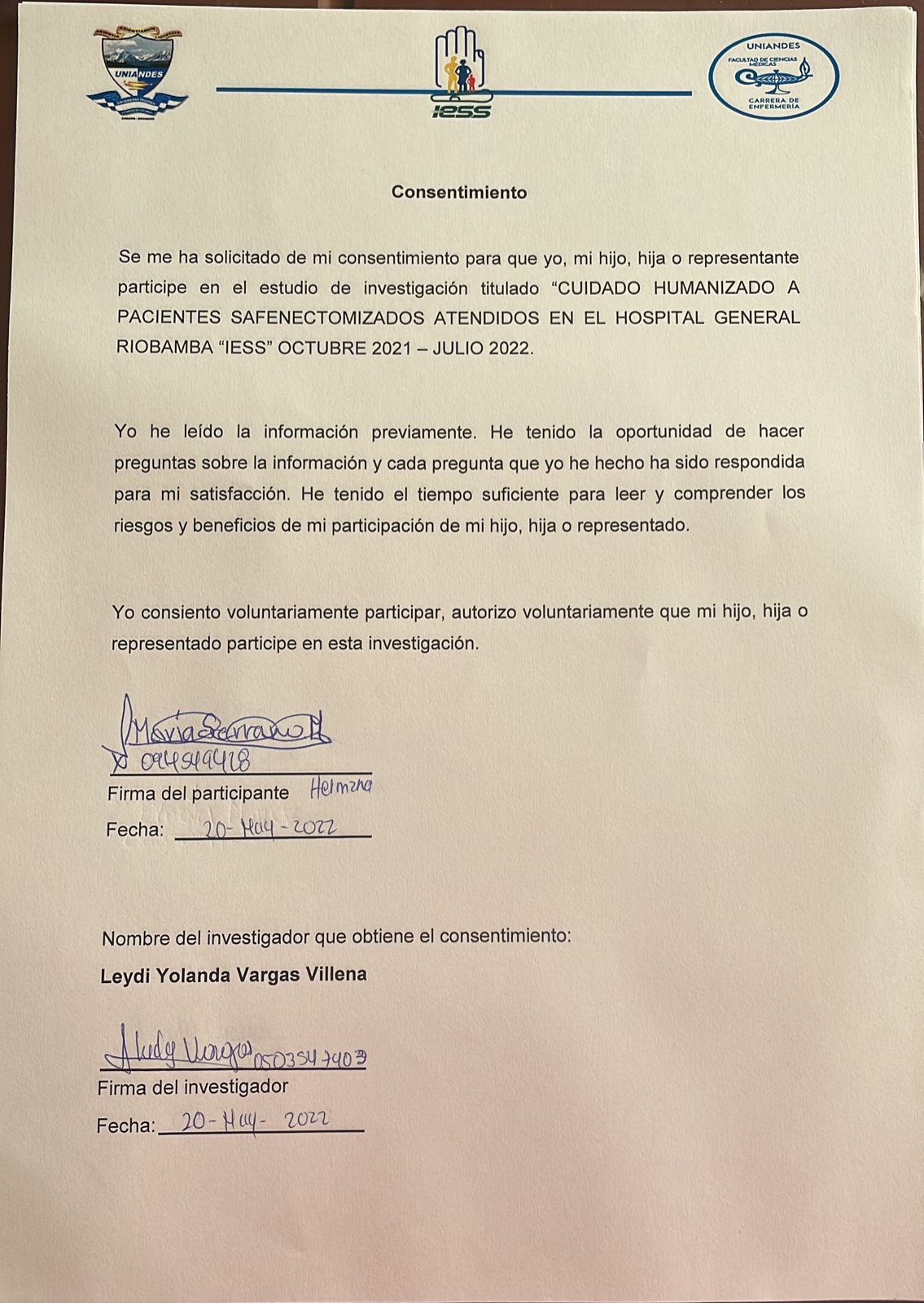 Venous insufficiency is a prevalent pathology worldwide, given the uncomfortable symptomatology it can cause, it is necessary to perform a conservative or surgical approach; humanized care is part of the post-surgical patient's recovery, it seeks to rescue the relationship of trust and empathy between the patient and the nursing professional. Objective. To evaluate the humanized care provided by the nursing staff in saphenectomized patients treated at the Hospital General Riobamba "IESS". Materials and methods. A quantitative, descriptive, retrospective, retrospective, observational study was carried out with a total population of 56 saphenectomized patients, who with prior informed consent participated in the study; for the collection of information, the survey was used as a technique, and as an instrument the questionnaire Perception of Humanized Care, made up of three variables: communication, quality and disposition of care; the process was carried out through the GoogleForms application. Results. The first dimension shows that 64.3% of patients always responded to humanistic and altruistic values; the second dimension, corresponding to the installation of faith and hope, 53.6% of patients responded almost always; the third dimension, cultivating sensitivity towards oneself and others, 37.5% of patients responded almost always; the fourth dimension, developing a relationship of humane care of help and trust, 23.2% responded almost always. Conclusions. Saphenectomized patients belonging to the surgical hospitalization service of the General Hospital Riobamba were found to enjoy humanized nursing care.
