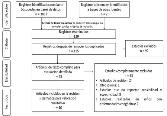 Para evaluar el índice HOMA-IR en el desarrollo de enfermedades endocrino-metabólicas en la población pediátrica con obesidad, mostrar sus limitaciones y utilidad diagnóstica, se usaron términos generales y amplios de búsqueda (obesidad pediátrica e índice HOMA-IR). Se localizaron aproximadamente 3855 artículos que fueron evaluados. Al revisar los títulos y resúmenes, seleccionamos 139 artículos, se eliminaron los duplicados, obteniendo 115 para el análisis. Después de aplicar los criterios de inclusión y exclusión, se asignaron 23 artículos para revisión detallada del texto completo, seleccionando 10 artículos para la extracción y análisis de datos. Ver Figura 2.