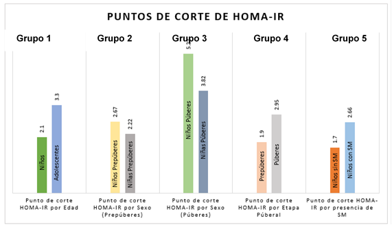 El HOMA-IR es un indicador matemático que ha demostrado tener gran utilidad para la detección y seguimiento de la resistencia insulínica. Actualmente algunos autores han validado esta prueba para identificar la incidencia de SM y DM2 en poblaciones jóvenes, incluso después de varios años (4,14). Otros trabajos demuestran que presenta una moderada a buena correlación con el Clamp (4). Su uso en la práctica clínica se ve limitado por falta de umbrales precisos (ausencia de evidencia longitudinal en pediatría) (14). Muchas investigaciones han marcado sus propios puntos de corte en diferentes poblaciones con el fin de buscar estandarizaciones, evidenciando los estados fisiológicos y patológicos que podrían alterar los resultados (15–17).