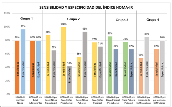 La menor sensibilidad calculada fue de 38,2% fue encontrada en niños y adolescentes obesos para determinar el riesgo de CMRF, mientras que la más alta fue del 100% en niñas prepúberes para determinar IR. La especificidad más baja encontrada para el HOMA-IR fue de 65,5% en niños prepúberes mientras que la más alta fue de 96,7% en niños obesos para determinar riesgo de SM.
