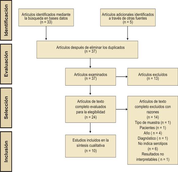 Una vez realizada la búsqueda en las bases de datos se encontraron un total de 38 artículos, solamente se eliminó un artículo duplicado. Los 37 artículos restantes fueron examinados a través de la lectura de sus títulos, resúmenes y aplicando los criterios de elegibilidad se eliminaron aquellos que correspondían a tesis de maestrías y especialidades. Se descartaron 13, resultando 24 artículos a los cuales se les realizó una lectura completa. Y aplicando los criterios de exclusión se descartaron 14 artículos debido a diferencias en el método de diagnóstico, resultados no interpretables y año de publicación. Finalmente se realizó la revisión sistemática con los 10 artículos. En la Figura 1 se resumen estos pasos.