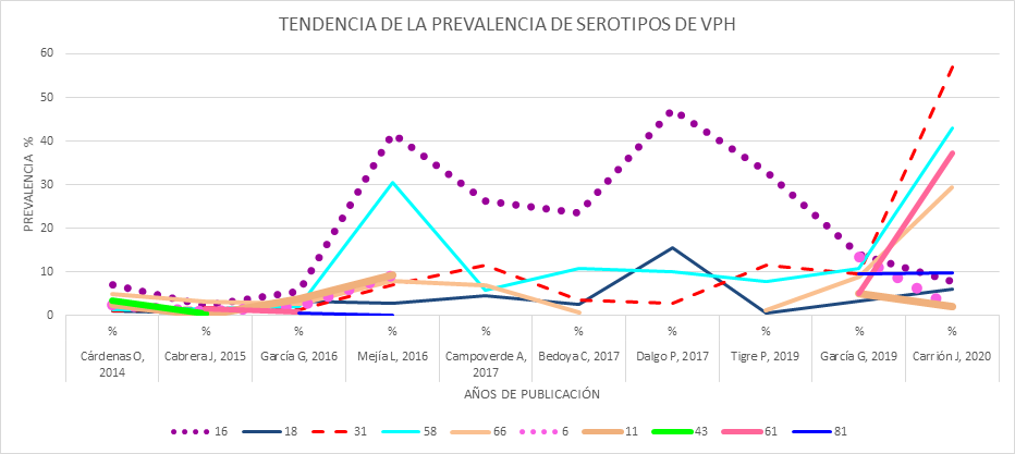 En el transcurso de los años se ha podido observar ascensos y descensos de la prevalencia de los serotipos de VPH en las mujeres ecuatorianas. Algunos de los serotipos de alto riesgo oncológico alcanzaron su pico máximo entre los años 2016 – 2019. En el último año se ha presentado un ascenso considerativo del serotipo 31 el cual alcanzó una prevalencia superior al 50%. Otros serotipos cuya prevalencia aumentó en el último año fueron el 18, 58 y 66; por otra parte, se observó un descenso del serotipo 16. En cuanto a los serotipos de bajo riesgo oncológico, el serotipo 81 presentó una tendencia de ascenso, el serotipo 61 es el que tiene un mayor aumento en su prevalencia. Los serotipos 6 y 11 presentaron un ascenso en el año 2019 y un descenso en el año 2020; y el serotipo que ha presentado una tendencia de descenso es el 43