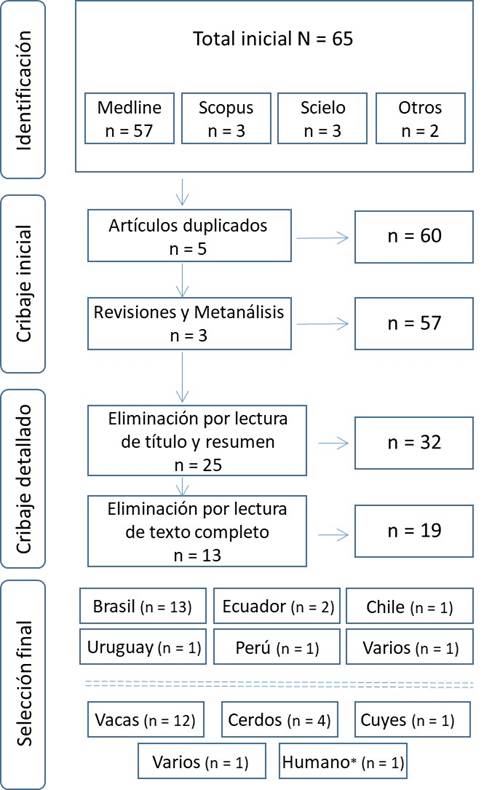 a investigación realizada fue documental, de tipo revisión sistemática, y estuvo basada en la metodología recomendada en declaración PRISMA (Preferred Reporting Items for Systematic reviews and Meta-analysis) (14). Para llevarla a cabo se definió una búsqueda de artículos científicos, sin restricción de idioma, disponibles en las siguientes bases de datos: SCOPUS, MEDLINE y SCIELO. Muy ocasionalmente se identificaron artículos en forma manual, a partir de citas presentes en otros estudios. Se emplearon los siguientes criterios de elegibilidad: artículos publicados en los últimos diez años, que contengan información acerca de la ocurrencia de cepas SARM en animales de granja en países de América del Sur, que incluyan información relevante acerca de la patogenicidad de dichas cepas SARM (en humanos y animales), detalles genéticos (presencia de genes de resistencia), multirresistencia a antibióticos, datos de concentración inhibitoria mínima, entre otros.