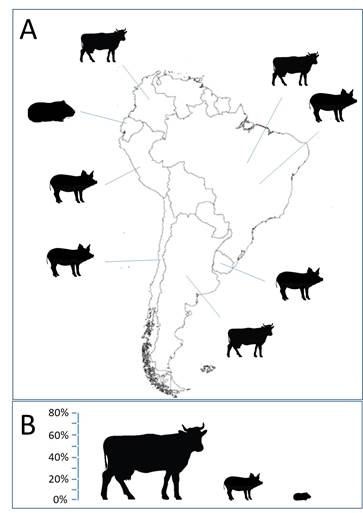 Figura 2. A) Origen geográfico de los artículos incluidos en la presente revisión; B) Representación porcentual de los artículos incluidos en función del tipo de animal estudiado.