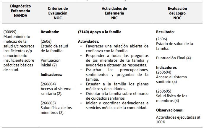 La aplicación del plan de cuidados estandarizados NNN en una familia vulnerable, permitió el abordaje holístico de los problemas identificados, que posibilitó establecer tres diagnósticos, ejecutar las intervenciones, para pasar de una puntuación diana de 2 a 4, que evidencian la efectividad en el logro de los resultados esperados.