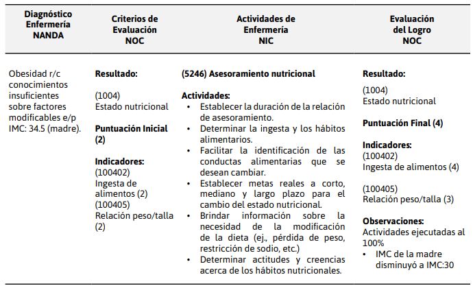 La valoración especial concluye que existieron: Mantenimiento ineficaz de la salud, obesidad, estreñimiento.