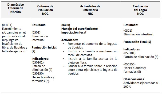 Con respecto al diagnóstico de la tabla 3; estreñimiento; NANDA define como la “disminución anormal de la frecuencia en las deposiciones siendo muy dificultosa e incompleta además estas son heces duras y secas”. En su estudio, Corrales (13) concluye que la medida inicial en el tratamiento del estreñimiento radica en el incremento de la fibra en la dieta, así como la ingesta de líquidos. En el presente estudio se educó a la familia acerca de la importancia del consumo de fibra en la dieta, la ingesta de líquido y ejercicio, por lo que se logró que la madre, asimile la información impartida y adquiera esa conducta modificadora de su salud, lográndose que evacúe con normalidad.