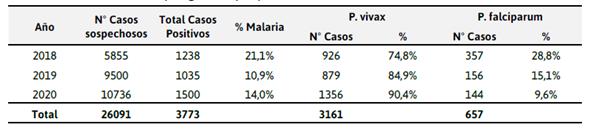 of the total positive cases of this last year, 90.4% correspond to P. vivax and 9.6% to P. falciparum. The year 2020 is where the