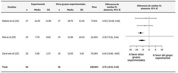 (8.66 [3.08, 14.23] 95%IC) comparado con los grupos sin intervención (NI) y los