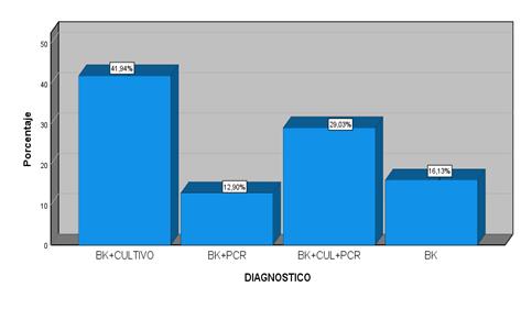 tuberculosis a VIH fueron de 11.29%. El método diagnóstico más empleado fue baciloscopia con cultivo representado el 41.9%. La