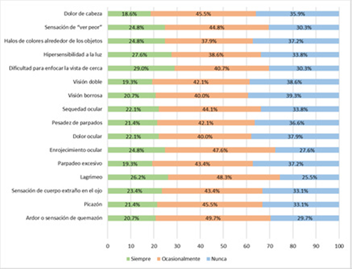 vermelhidão nos olhos. Da mesma forma, foi estabelecido que algumas variáveis sócio-demográficas e ergonômicas, como sexo, tempo de