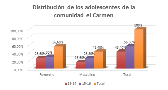 Gráfico 1. Distribución de los adolescentes de la comunidad el Carmen según edad y sexo en el periodo de marzo a septiembre del año 2018.