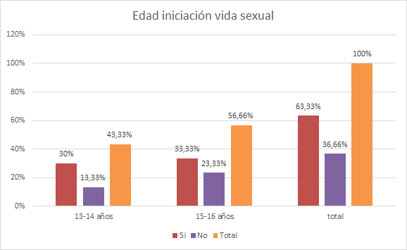 Posteriormente, se observó en el gráfico 2 que el 63.33 % de los adolescentes si han iniciado relaciones sexuales, las edades que predominaron fueron los 15 y 16 años con un 33.33 %. Mientras que el 36.66% no han tenido relaciones sexuales. Estos resultados llaman poderosamente la atención debido a que estos adolescentes ya han iniciado sus relaciones sexuales y con ellos los riesgos asociados a esta actividad si no se toman las medidas preventivas.