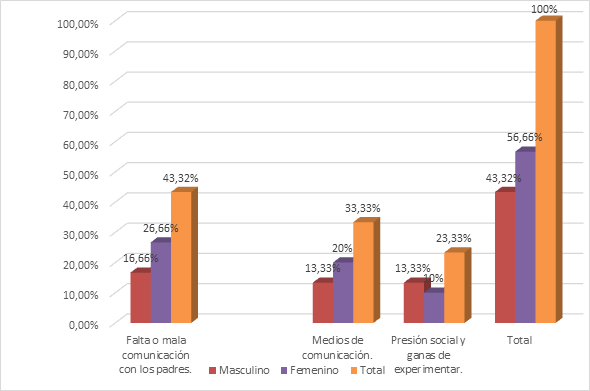 Entre los factores que promueven el inicio de las relaciones sexuales precoces predominó la falta o mala comunicación con los padres en el sexo femenino con un 43.32%. En estos resultados se observa que la frecuencia de haber tenido relaciones sexuales era menor en aquellos que frecuentemente habían tratado con los padres cuestiones sobre el amor y el enamoramiento, así como sobre temas de biología sexual, como los cambios sexuales que experimentan. Seguido de la influencia de los medios de comunicación con un 20% también en el sexo femenino lo que hace inferir que el sexo femenino se encuentra más vulnerable a iniciar las relaciones sexuales de forma precoz y en tercer lugar la falta o mala comunicación en los padres en el sexo masculino con un 16.66%. Otras causas que favorecen el inicio precoz de las relaciones sexuales son los medios de comunicación con un 13.33% en el sexo masculino entre ellos el internet “redes sociales”, la radio y televisión que cada día se encarga de enviar mensajes subliminales a los adolescentes, la presión social con 13.33% en el sexo masculino que ejercen los grupos en las aulas de clases donde interactúan la mayoría del tiempo.