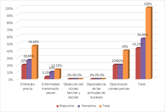 Los adolescentes no conocen las consecuencias del inicio temprano de las relaciones, solo el 46.67% afirmaron que el embarazo precoz es una de las consecuencias. El impacto del embarazo en la adolescencia es psicosocial y se traduce en deserción escolar, mayor número de hijos, desempleo, fracaso en la relación de pareja e ingresos inferiores de por vida. Contribuye a perpetuar el ciclo de la pobreza y la "feminización de la miseria". El embarazo en la adolescencia representa un serio problema social, y se considera desde el punto de vista médico y social como una situación de riesgo por ello la importancia de dar a conocer información oportuna y eficaz que demore el inicio de las relaciones sexuales en los adolescentes, otra de las consecuencias que conocen los adolescentes son las enfermedades de transmisión sexual con un 13.3% esto demuestra que a pesar de que el conocimiento de la existencia de métodos anticonceptivos es universal en mujeres entre los 13-29 años, sólo 15% ha usado un método alguna vez en su vida y 10% lo usan en su primera relación sexual. (Gráfico 4).