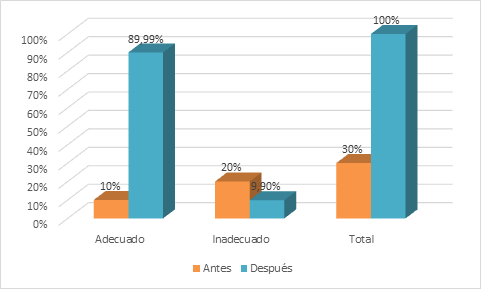 Para cerrar, se observó que antes de la intervención el 33.33 % de los adolescentes, tuvieron un conocimiento adecuado, seguido de un 66.66% de adolescentes que tuvieron un conocimiento inadecuado. Después de la intervención se logró elevar el porcentaje dando como resultado que el 89.99 de los adolescentes tuvieron conocimientos adecuados. Posterior a la intervención educativa según su edad, arrojaron que el 89,9% de ellos tuvieron un conocimiento adecuado y en 9.9% obtuvo un nivel de conocimiento inadecuado acerca de las consecuencias que acarrean el inicio precoz de las relaciones sexuales (Gráfico 5). Por tanto, se puede deducir que la intervención educativa realizada a los adolescentes tuvo el efecto de aumentar los conocimientos inadecuados con respecto a la salud sexual y principales consecuencias de iniciar de manera temprana sus relaciones sexuales.