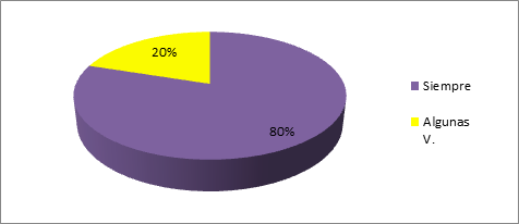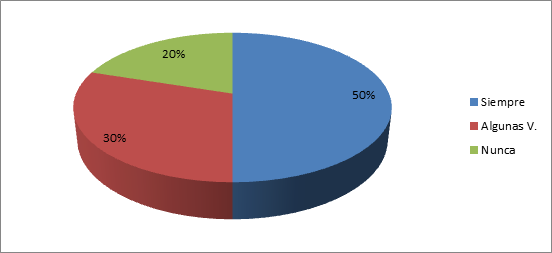 Los encuestados en cuanto al aumento de la dosis diaria de analgésicos narcóticos, opinaron; siempre 50% (25 sujetos), algunas veces 30% (15 sujetos), 20% (10 sujetos) nunca (Gráfico 2). Por tanto, se puede referir que el 80% de los sujetos del estudio, están expuestos a la adicción a los analgésicos narcóticos debido a que están acostumbrando al organismo a recibir dosis cada vez mayores tanto en miligramos como en frecuencia de consumo. La persona acostumbra al organismo a recibir cada vez mayores cantidades de la sustancia (analgésicos), para obtener el efecto deseado, que resulta placentero, lo que se denomina tolerancia (10).