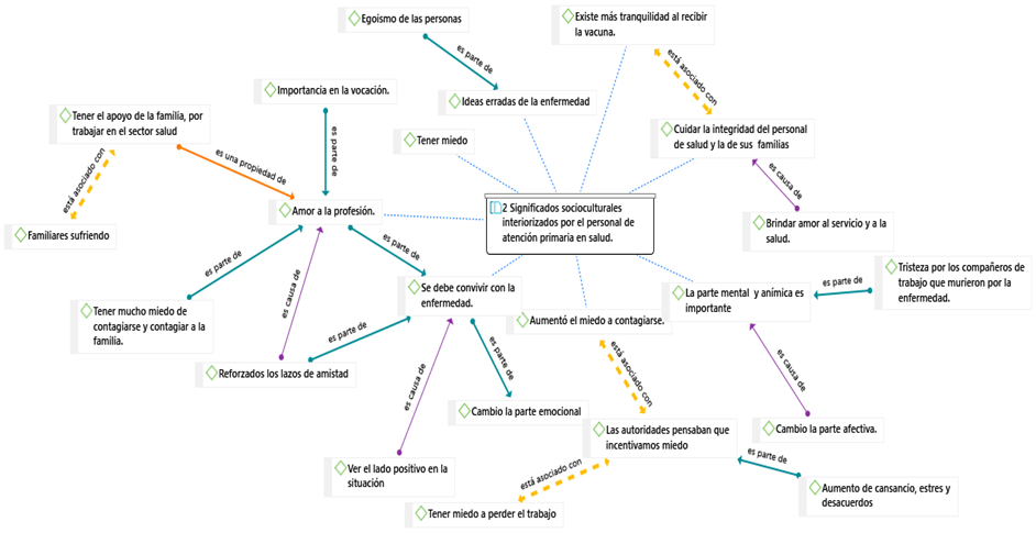 En este acápite se muestran los hallazgos relacionados con los significados socioculturales que ha interiorizado el personal de primer nivel de atención en salud. En la figura 2, se ilustra una red que muestra las relaciones establecidas; y, en la Tabla 3, una síntesis de los principales significados construidos.