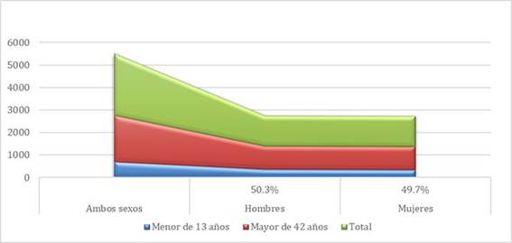 e interpreta el rango de edad según el sexo, que predominó en los habitantes de la comunidad de San Eduardo, de 2.759 personas, correspondió un 75 % (n=2069) a los mayores de 42 años y en un 25 % (n=690) a los menores de 13 años; la edad promedio de la población es de 28,6 años; una mediana de 25 años y la máxima de 99 años. De los cuales 1.388 (50,3 %) fueron hombres y 1.371 (49,7 %) mujeres que no representa diferenciación significativa con respecto al sexo de la población. (Gráfico 1).