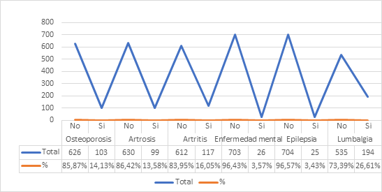 Se pudo conocer que prevalecieron las enfermedades músculo esqueléticas de acuerdo al porcentaje de los participantes del estudio de investigación que contestaron Si, predominando la lumbalgia, artritis, osteoporosis, artrosis y en menor proporción los trastornos neurológicos centrales relacionadas a la enfermedad mental y epilepsia.