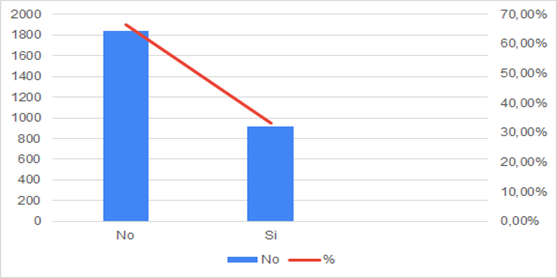 De acuerdo con el estudio 1.891 participantes contestaron NO realizar actividad física o algún tipo de deporte. Siendo este detalle proporcional a los dolores de espalda que se refirió anteriormente. Se observa que 868 personas contestaron que Sí realizan algún tipo de ejercicio físico, siendo este grupo el adecuado, para estándares de vida saludable. (Figura 3).